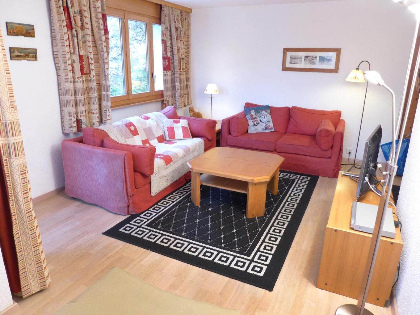 Apartment. 3-room apartment 75 m2 on 4th floor: livingdining room with 1 sofa bed, cable-TV, radio, CD-player and DVD. 1 childrens room with 1 bed (90 cm, length 200 cm), 1 x 2 bunk beds (90 cm, length 200 cm). 1 room with 2 beds (90 cm, length 200 cm). Kitchenette (4 hotplates, oven, dishwasher, electric coffee machine). BathWC. Terrace 10 m2, west facing position. Terrace furniture, box-room. View of the mountains and the forest. Reserved parking, garage space n 76, height 200 cm.