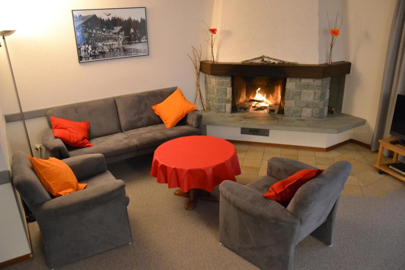 Two-Bedroom Apartment. This apartment ison a ground floor and is wheelchair accessible. There is a large south-facing balcony with its rustic corner, dining table and sun loungers. A large and bright living and dining room comes with a seating area, a sofa, and a fireplace. A kitchen is fully equipped with a dishwasher, ceramic hob, oven, large refrigerator, microwave, toaster, espresso machine, complete fondue and raclette equipment.